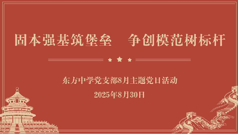 为推动本支部深入贯彻中央八项规定精神学习教育工作,深入落实本系统党建“筑垒”计划,全力争创模范支部,2025年8月30日下午,东方中学党支部组织开展了“固本强基筑堡垒争创模范树标杆”8月主题党日活动。活动由党支部书记孙丹主持,全体党员、发展对象及入党积极分子参会。