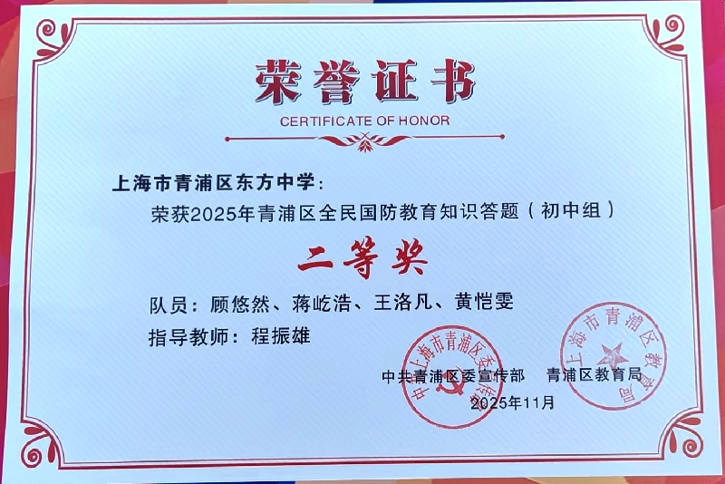 我校学生获2025年青浦区全民国防教育知识答题(初中组)二等奖