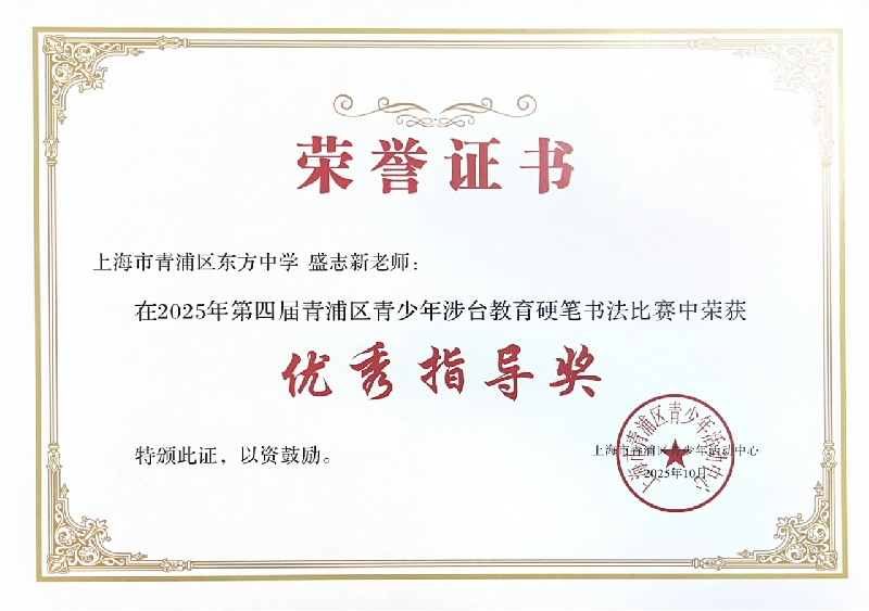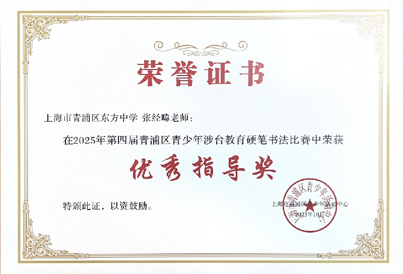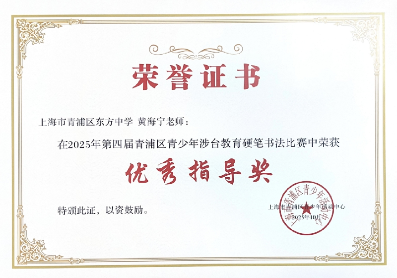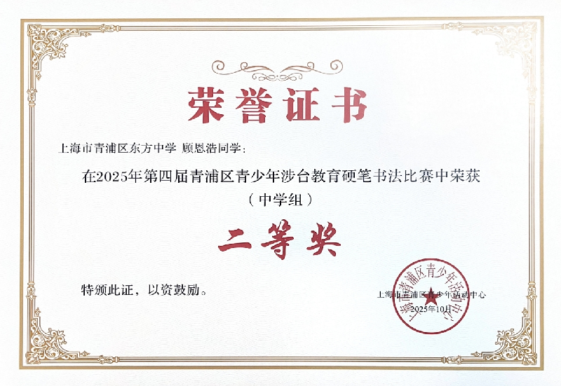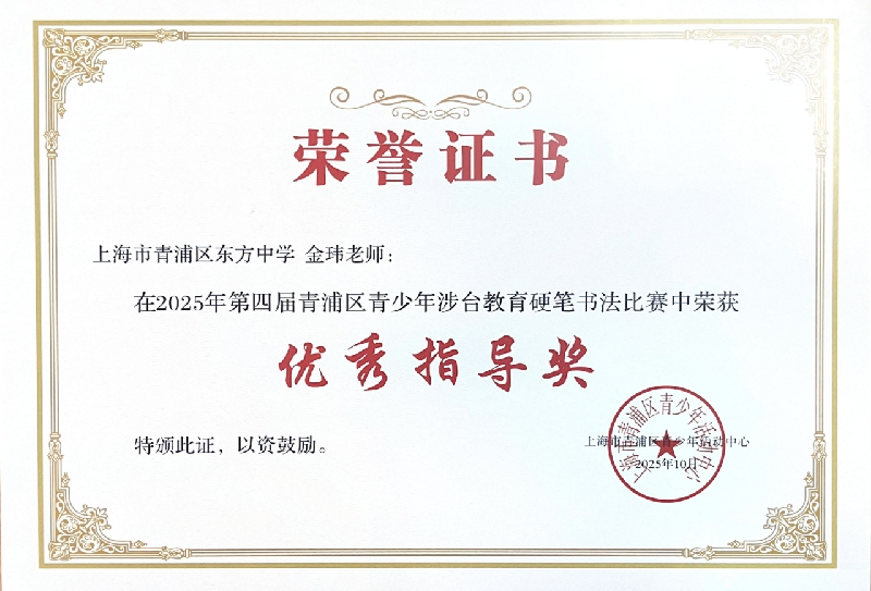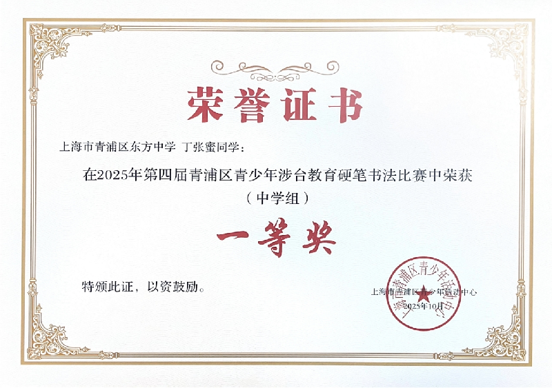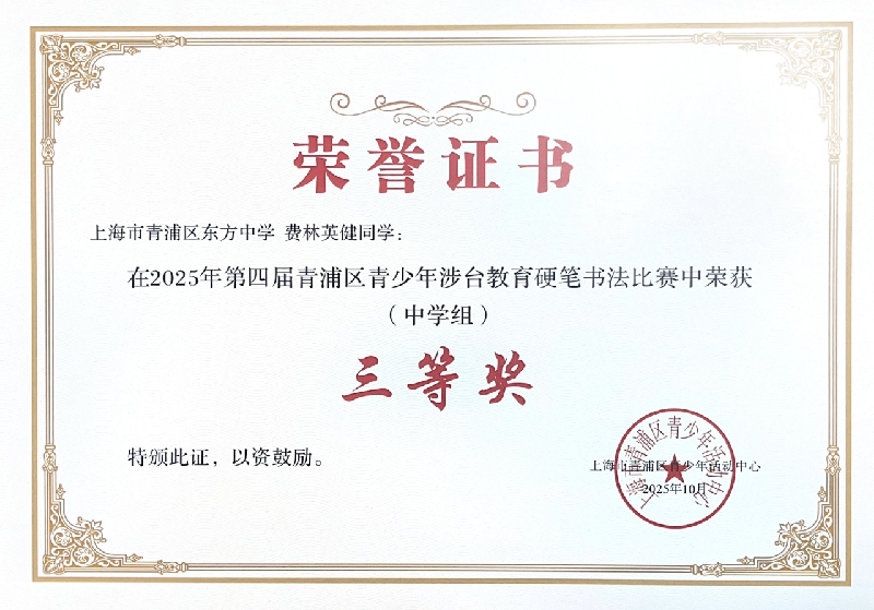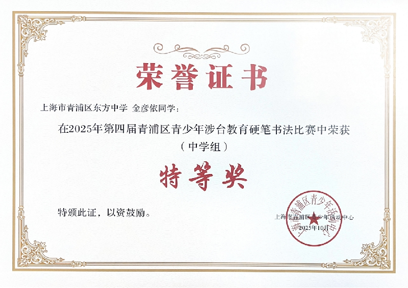 我校金彦依等同学在2025年第四届青浦区青少年涉台教育硬笔书法比赛中获奖