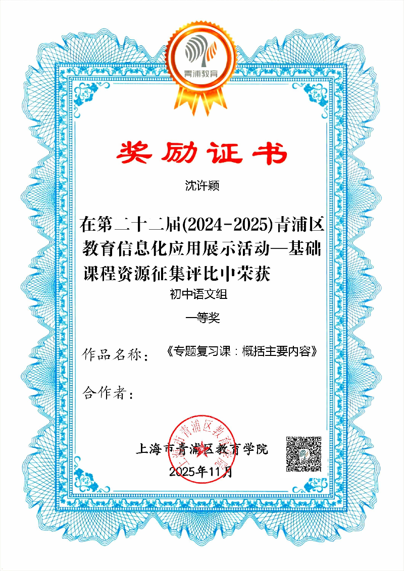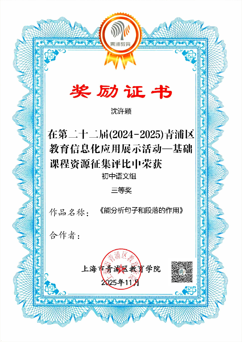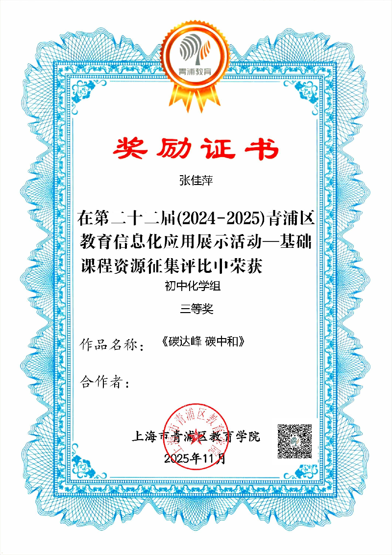 第二十二届(2024-2025)青浦区基础教育数字资源征集评比教师获奖
