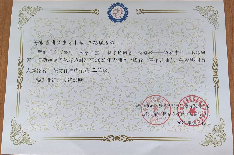 我校王路遥、刘梅老师在2025年青浦区“践行'三个注重’,探索协同育人新路径”征文评选中获奖
