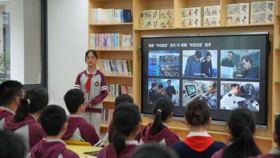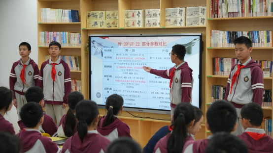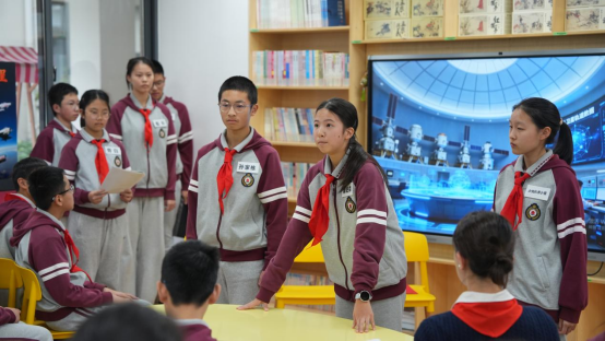 队会以九三阅兵视频开篇,队员们通过课前研学分享、情景剧演绎、AI辩论等形式展开交流。逐云小队、搏云小队结合东方绿舟研学经历,追溯我国航空工业从“跟跑”到“并跑”向“领跑”的跨越历程;穿云小队分享马伟明院士科技报国故事,传递科研担当;揽星小队演绎《银河跨越北斗》情景剧,再现自主导航系统的崛起之路。与AI围绕“科技创新离中学生远不远”的辩论,更让队员们坚定科创信心。