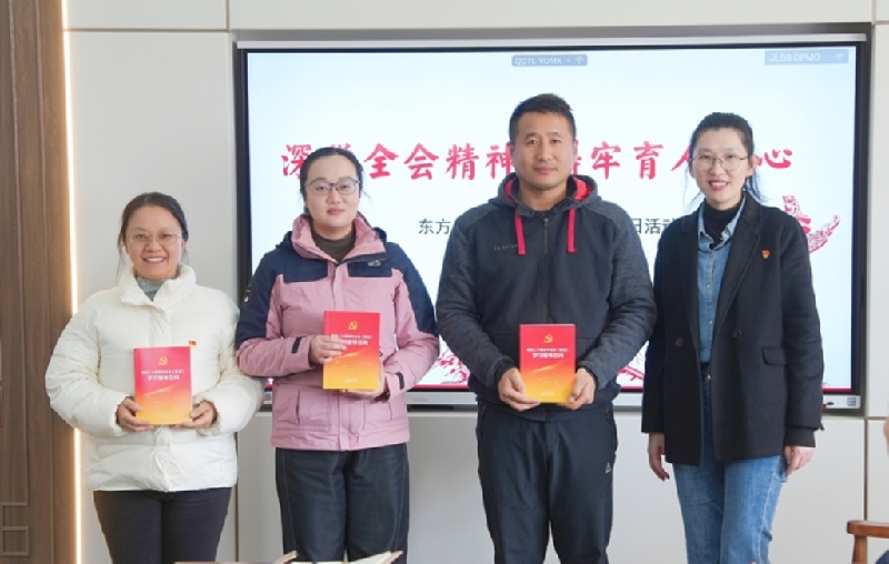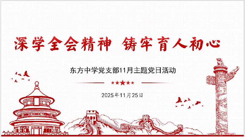 为深入学习贯彻党的二十届四中全会精神,切实把学习贯彻全会精神同推动学校教育高质量发展结合起来,引导全体党员强化使命担当、筑牢育人初心,2025年11月25日中午,东方中学党支部在学校党建活动室组织开展了“深学全会精神 铸牢育人初心”11月主题党日活动。活动由党支部书记孙丹主持,全体党员、行政、入党积极分子及团员教师参加。